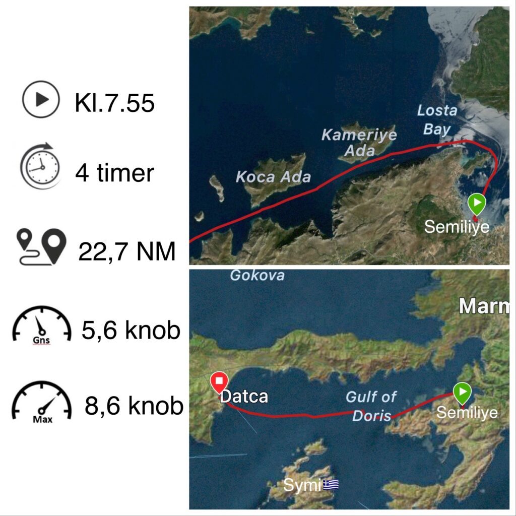 Det var en sejltur på ca. 22 sømil, og vi håbede på, at vi kunne sejle for sejl. Vinden skulle komme fra vest, så vores plan var at sejle forbi et par små øer Kameriye og Koca, og så stikke syd mod Datca for sejl. Vi startede stille og roligt for motor med at sejle inden om øerne, det var en smuk morgen og et smukt landskab.