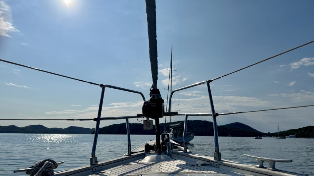Øen Dogi Otok ligger som en del af Nationalparken Telascica. Her er der en masse små skønne bugter, hvor vi kunne ligge på bøje eller for anker. Mulighederne var inkluderet i den pris på 180€, vi havde betalt for at været i Nationalparken.